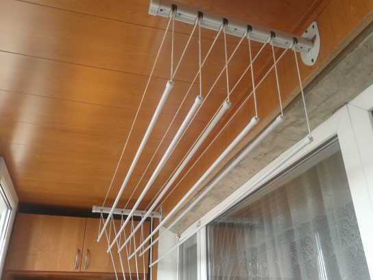 Обивка потолка стандартного балкона декорпанелями МДФ и установка сушилки на стену