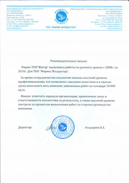 Рекомендательное письмо ТОО "Фирмы Жолдостар"