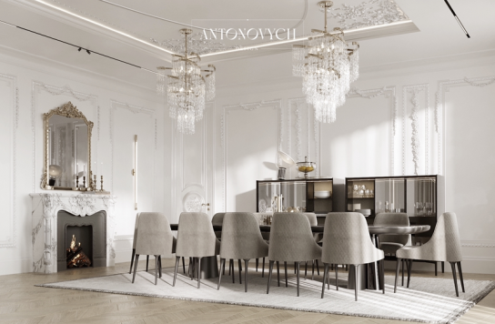 Невероятно яркий и выразительный облик интерьера в стиле ар деко отражает те прекрасные моменты роскоши, которые сейчас находятся на пике моды. Каждый новый проект студии Luxury Antonovich Design – это шедевр дизайнерского искусства. Этот проект сочетает в себе благородство классики и праздничное настроение ар деко. Основную часть гостиной занимает зона столовой, что очень ярко и точно говорит о радушии и гостеприимном характере владельцев дома. Большой обеденный стол окружают высокие стулья с благородной осанкой, которые обиты благородным текстилем изумрудного оттенка. Утонченность форм и линий характерна для дизайна потолка. Это шедевр современной классики, который сегодня возможно, благодаря новым технологиям. В интерьере царит идеальная гармония. Убранство окон в духе классики облагораживает интерьер, привнося некий оттенок торжественности. Очаровательно и лаконично вписались интерьер два мягких дивана, обитых бархатом молочного оттенка. Уютным и лаконичным продолжением интерьера стала функциональная и роскошная кухня. Дизайн интерьера Алматы в полной мере подчеркивает радушие владельцев дома.