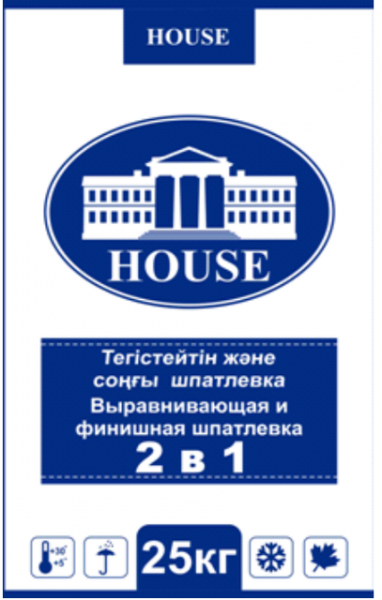Выравнивающая и финишная шпатлевка на полимерной основе, предназначенная для выравнивания оштукатуренных поверхностей. Шпатлевка "HOUSE" от казахстанского производителя оптом и в розницу в мешках по 25кг.