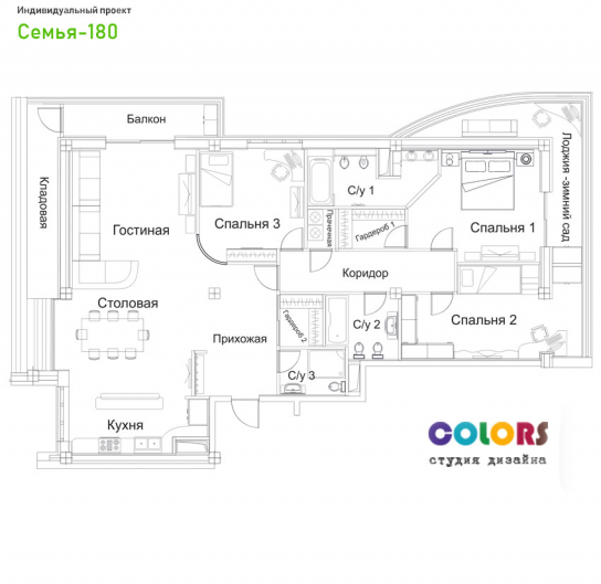Детальная планировка помещений. Общая площадь 180 кв.м. 3 отдельные спальни 3 санузла, 2 гардероба, прачечная, зимний сад, кладовая, кухня с гостиной. Большой и интересный проект - полностью реализованный в соответствии с дизайн-проектом.