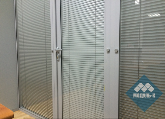 Офисные перегородки из алюминиевого профиля, двойного остекления, стекло 6мм, каленое, межрамное жалюзи. Дверь одностворчатая, распашная