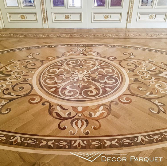 На фото овальная розетка состоящая из художественных элементов, дополненная мозаикой с повторяющемся рисунком наборного паркета, оформленная бордюром со сложным контуром. Композиция выполнена из таких пород древесины как дуб, клён, мербау, орех. Все элементы выполнены на высококачественном оборудовании ☝️Такое напольное покрытие никого не оставит равнодушным