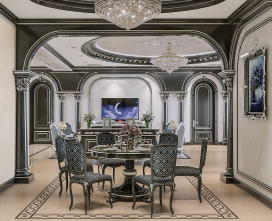Проект - https://mirt.ua/project/interer-gostinoj-s-epatiruusim-reseniem Богатые декорации -- колонны, арки, витражи, дорогие ткани, достойно дополняют благородную основу. А отдельно стоящая мебель с напылением серебра, фокусирует всё внимание на себе. На полу мы видим роскошный ворсистый ковер – он обеспечивает комфорт и вносит дополнительный акцент гармонии и уюта.