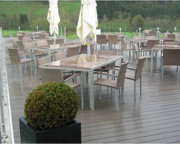Древесные материалы плюс «пищевой полимер», полипропилен - в итоге влагостойкая, долговечная, прочная и самое главное - экологически чистая продукция. Изделие не боится воздействия влаги, солнца, ветра и вредителей, без проблем выносит нагрузку в 500 кг на квадратный дециметр. Поверхность декинга приятна и комфортна для ног. Профиль доски позволяет уверенно ходить по поверхности, не боясь поскользнуться. Террасная доска подвержена дополнительной обработке, делающей ее поверхность матово-шершавой, что значительно уменьшает скольжение и придает всей поверхности благородный вид.