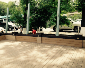Завершена отделка балкона композитной террасной доской. Данный вид покрытия нашел свое применение не только в качестве напольного покрытия, но и для отделки стен всего балкона. Так как данный балкон открытый и не застеклен - этот материал, пожалуй, самый подходящий в качестве такой отделки, потому что имеет высокие эксплуатационные характеристики для уличного применения.
