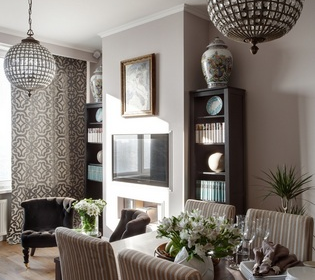 Графичный геометрический рисунок на шторах и шаровидных восточных люстрах - лицо ардеко в этом интерьере.