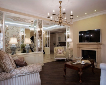 Гостиную украшает био камин в классическом портале, кованая люстра, состаренные зеркала с кованными бра в виде подсвечников.