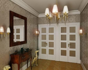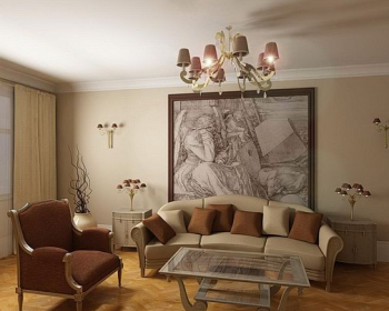 Работая над таким заданием, было принято решение разграничить квартиру на интимную часть, куда вошли детская спальная и хозяйские комнаты, которые были выполнены в сдержанных тонах и без излишеств в декорировании. В парадную часть квартиры, предназначенную для приёма гостей, вошли холл и гостиная, которые оформлены в классическом стиле - достаточно изысканно, но при этом сдержанно.