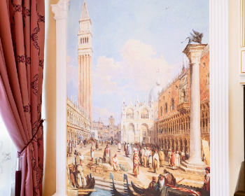 Изысканно и безупречно выглядит каждый реализованный проект от Бутика Элитного Декора Antonovych Home. Оформление окон немаловажный момент в дизайне интерьеров. В работах Светланы Антонович он становится одним из главных украшений элитных интерьеров. Шторы – незаменимый акцент на уютном настроении в любом доме. Роскошные итальянские шторы, которые представлены на фото очень гармонично вписались в интерьер. Они составляют единое целое с общей композицией, где все взаимосвязано, мебель, декор стен, декор окон и потолка. Популярность такого оформления окон, как итальянские шторы, обусловлена возможностью вписать такие шторы в любой интерьер. Главное продумать гармонично цветовую гамму и фактуру ткани, а также подобрать идеально отделку и аксессуары. Роскошный шелк рубинового оттенка, который дизайнер предложила для штор идеально гармонирует с бархатом в обивке стульев. Этот сочный оттенок идеально подчеркивает художественную роспись на стене с изображением площади Сан Марко в Венеции. Сочные оттенки придают атмосфере апартаментов ощущение приятной теплоты летнего вечера. Итальянские шторы стали идеальным решением для этого интерьера.