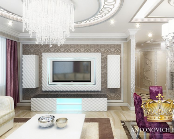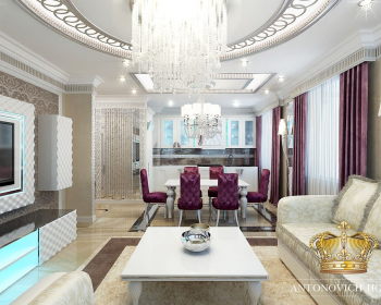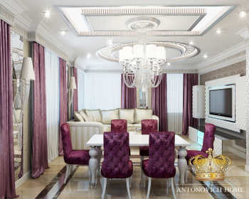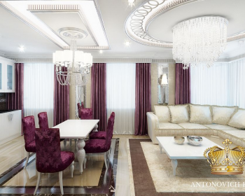 Бесконечное количество красивых интерьерных историй отражено в работах главного дизайнера Бутика Элитного Декора Antonovych Home, Светланы Антонович. И в каждой истории есть своя изюминка, свои изысканные акценты. В этом интерьере ярким и сочным акцентом стали роскошные шторы из натурального шелка насыщенного рубинового оттенка. Просторные апартаменты объединили в себе гостиную столовую и кухню. Благодаря большим окнам, в помещение попадает достаточное количество солнечных лучей. Яркий свет смягчают полупрозрачные тюли молочного оттенка. Благодаря очаровательному контрасту, шелковые шторы смотрятся особенно ярко. В интерьере преобладает приятная гамма легких светлых тонов. И в этой палитре восхитительными, страстными нотками стали рубиновые шторы и бархатные стулья в зоне столовой. В апартаментах очень тонко и изящно переплетается уютное настроение с праздничными и нарядными штрихами. И этой праздничной ауре интерьер во многом обязан красивым шторам. Шторы подчеркнули лаконичность и элегантность всего дизайн проекта, гармонично вписавшись в изысканную картину современной роскоши.