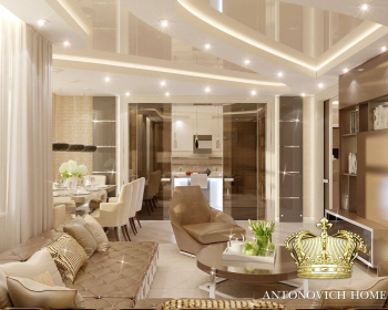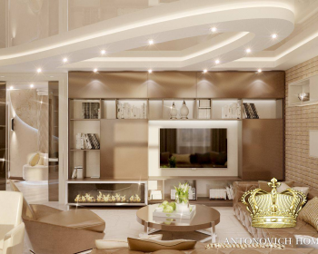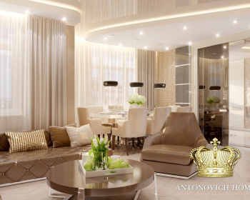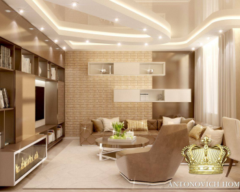 Вкусно, тепло, уютно, роскошно, неподражаемо… И еще множество прекрасных эпитетов можно озвучить, чтобы описать этот очаровательный интерьер в современном стиле от Светланы Антонович. Приятные эмоции душевной теплоты и солнечного настроения дарят апартаменты квартиры. Одно лишь созерцание интерьера приносит эстетическое наслаждение, а обладание такой роскошью дополнительно навевает прекрасное ощущение счастья. Выразительные черты уютного пространства очень ярко демонстрируют то, насколько мягким и нежным может быть лаконичный современный стиль. Дизайнер интерьера очень тонко объединила несколько ярких акцентов. Дизайн потолка тесно взаимосвязан с декором стен, а мебель с оформлением окон. Освещение интерьера продумано таким образом, чтобы подарить достаточное количество света каждому уголку. Кирпичная стена в гостиной перекликается с современным камином, даря интерьерную прекрасное настроение теплоты домашнего очага. Эту теплоту поддерживают и карамельные оттенки, которые преобладают в интерьере. Интерьер просто дышит свежестью летнего утра.