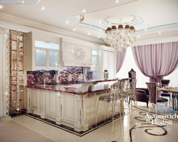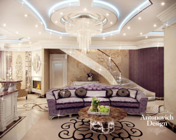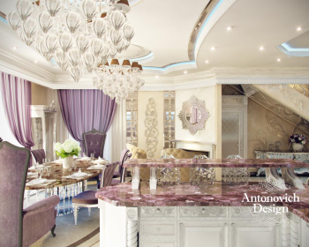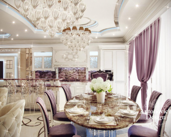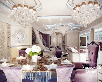 Шикарный особняк в Алма-Ате идеально отражает восприятие жизни его владельцев. Елена Антонович предложила для этого проекта ар деко, поскольку именно этот стиль более всего способен отразить праздник жизни. Дизайн дома в Алматы стал реализацией мечты его владельцев о своем неповторимом по красоте интерьере. Пышное убранство, сочные краски и эффектные декоративные приемы образуют очаровательную картину роскоши и уюта. Пространство очень гармонично объединяет в себе респектабельность и оттенок романтики. Продумана каждая деталь. И каждый уголок дома эстетически совершенен. Не может не очаровать прекрасная лестница, ведущая на второй этаж особняка. Округлые формы подчеркнуты современной светодиодной подсветкой. Неотъемлемой частью этого прекрасного образа стал декор стены. Она полностью декорирована мягкой настенной панелью с милым эффектом «гофре». В этой удивительной интерьерной истории важную роль играют нарядные люстры, комфортная мебель и изысканный декор полов. Визуальное совершенство интерьера искусно вуалирует технологичные моменты. Интерьер окутывает приятным и романтичным настроением, даря радость от эстетического наслаждения.
