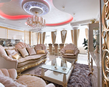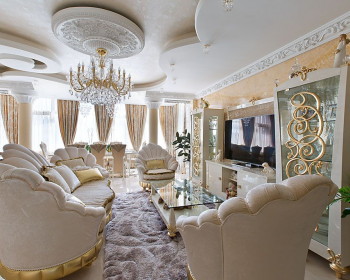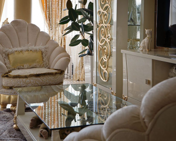 Одним из главных украшений гостиной стала роскошная мебель Lanpas. Элитарность мебели подчеркивает обивка из бархата молочного оттенка, позолота и декоративный пух. Мебель дарит чувство абсолютного комфорта и эстетическое наслаждение.
