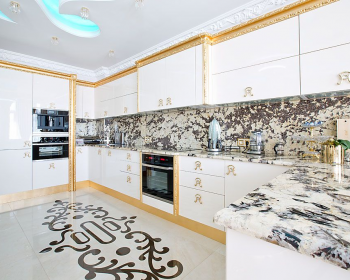 Интерьер кухни украшает мебель Concreta Cucine. Белоснежные фасады очерчивает резной декор с сусальной позолотой, а за фасадами скрыты самые современные системы хранения. Рабочие поверхности из мрамора и оникса безупречно вписались в роскошный облик интерьера кухни.
