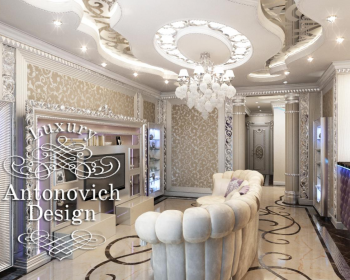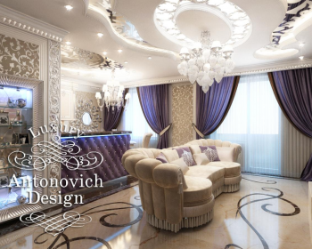 Интерьеры с особенным шармом, со своим уникальным характером и неизменно роскошным обликом создает Студия Элитных Интерьеров Antonovych Design под руководством Елены Антонович. Дизайн квартиры Алматы выполнен в стиле ар деко. И как подобает этому стилю, здесь все подчеркивает приятное настроение вечного праздника жизни, благодаря которому этот стиль по-прежнему на пике моды. В интерьере царит безупречная гармония и все элементы декора искусно взаимосвязаны между собой. Это высокий стиль, который базируется на таланте дизайнеров и их многолетнем успешном опыте создания интерьеров класса люкс. Восхищает, как тонко перекликаются завитки узором на полу из натурального мрамора с очертаниями ниш на потолке. Яркими акцентами стали шторы и обивка барной стойки, поддерживая такой модный в этом сезоне фиолетовый цвет. Ажурные кружева узоров, которые покрывают элитные обои, изумительно сочетаются с резными рамами. В интерьер спальни праздник роскоши приобрел оттенок величественности. Роскошная кровать изумительно смотрится на фоне мягкой настенной панели, которая декорирована точечными светодиодными светильниками. И дополняет этот праздник жизни головокружительный балдахин на потолке в окружении резных узоров.