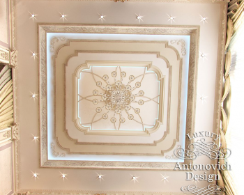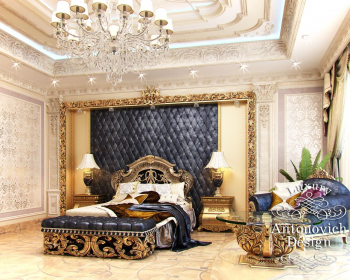 Соблазнительный комфорт с невероятно пышными и роскошными формами в интерьере этой спальни восхищает сочетанием великолепия и гармонии. Апартаменты одной из спален в элитном особняке Алматы выражают истинное величие современной классики с акцентами ар деко. В этом сезоне правит пурпурный и синий оттенки. И в этом роскошном интерьере мягкая настенная панель обита благородным бархатом глубокого синего оттенка, который восхитительно смотрится в обрамлении золотой резной рамы. Выразительные черты интерьера достигнуты за счет тесной взаимосвязи декора стены, потолка с обликом мебели. Это высокое искусство создания элитных интерьеров. Каждый такой проект олицетворяет роскошь новой эпохи, становясь шедевром дизайнерского искусства. Роскошная кровать с резным декором ручной работы с золочением идеально вписалась в общую картину интерьера. Убранство кровати одновременно гармонирует как с декором стены, так и с убранством окон. Высокие потолки украшает многоярусная ниша с лепным декором, пышной люстрой и нежно-голубой подсветкой. Дизайнеру интерьера удалось удивительное сочетание романтичного настроения с дворцовым величием. Дизайн дома Алматы выражает респектабельность и аристократизм его владельцев.