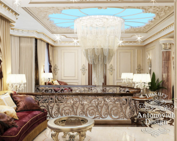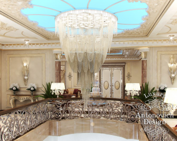 В дизайн проекте дома классический стиль очень гармонично переплетен с праздничным стилем ар деко. Захватывает дух от восторга центральная часть дома, где роскошная лестница стала центральной осью великолепия апартаментов дома. Дизайнеры интерьера, проникнувшись настроениями и желаниями владельцев дома, особое внимание уделили освещению. В результате интерьер искрится прекрасными переливами хрусталя и блеском декоративных решений в оформлении полов и стен. В мраморной глади пола с изысканными резными узорами отражаются блики роскошных люстр, которые прикреплена к потолку второго этажа. Потолок, откуда берет свое начало люстра, украшен в лучших традициях классического стиля изысканным лепным декором, а также современной круглой нишей из акрила с нежно-голубой подсветкой. Большая лестница с плавными очертаниями и круглым основанием выглядит очень роскошно и грациозно. Кованные золоченые завитки балюстрады подхватывают мотивы завитков узоров на мраморном полу. За лестницей дизайнеры интерьера студии Antonovych Design расположили уютную гостиную. Здесь прекрасным авторским решением стало переплетение мотивов убранства окон и декора стен с объемными 3D панелями и текстильными. Сочетание благородного бархата, натурального шелка, мрамора, ценных пород дерева придают авторскому интерьеру аристократические и благородные черты. Дизайн дома Алматы стал отражением роскоши новой эпохи и новым шедевром от талантливых авторов.