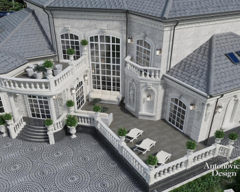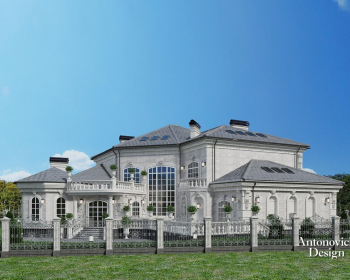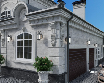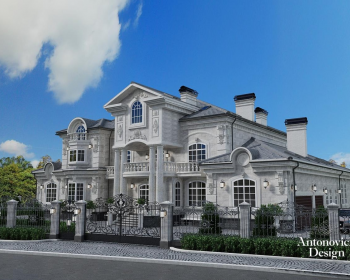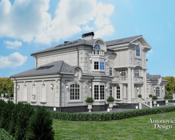 Вариации с классическим стилем всегда отражают дух современной эпохи и сегодня Ваш дом может быть ват таким роскошным архитектурным шедевром, который будет радовать не одно поколение. Вся гармония классики, которая сочетает строгость линий с нарядными архитектурными элементами, воплощается в яркий облик роскошного загородного особняка. Изысканность убранства и торжественное величие исходит от этого здания. Колонны, карнизы, балконы, балюстрады окружают высокие окна. Благодаря этому в любое время суток игра светотени на стенах здания придает ему дополнительную красоту и легкость. Светотень — играет большую роль в выявлении пластических свойств сооружения, благодаря можно идеально подчеркнуть пластику жилого дома. Скаты крыш венчают этот архитектурный ансамбль, усиливая гармонию и сочетание с ландшафтным дизайном. Дизайн коттеджа Астана отражает грандиозные возможности Студии Элитных Интерьеров Antonovych Design. В композиции жилого дома нашли отражение изысканные конструктивные решения. Это прекрасный архитектурный образ, который подчеркивает респектабельность и безупречный вкус владельцев дома.