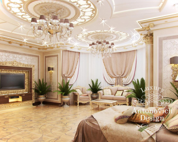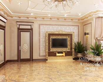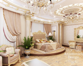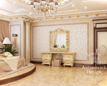 Спальня в доме – это особенные апартаменты, которые призваны служить приятным моментам отдыха и наслаждения. Роскошный интерьер спальни объединил в себе мотивы элегантной классики и нарядные акценты ар деко. Просторные апартаменты включают в себя две отдельные зоны. Непосредственно спальную зону и зону отдыха у окна. Пышное убранство присуще всем элементам декора. Роскошные потолки украшают круглые ниши с подсветкой сквозь завитки золотистых узоров, и нарядные люстры с хрустальными подвесками. Дизайн спальни обрел свое особенное солнечное и праздничное настроение, благодаря теплой цветовой гамме и обилию золота в декоре. Резные золоченые рамы гармонично сочетаются с резной инкрустацией мебели. Объединяет это теплое и уютное настроение паркетный пол с резными узорами. Соблазнительную нежность и комфорт олицетворяет роскошная кровать с высоким резным изголовьем. Она вынесена на невысокий круглый подиум. А завершенной эту прекрасную композицию делают две грациозные колонны с лепными золочеными капителями. Роскошные апартаменты спальни с выразительными акцентами и уютным характером стали гармоничным продолжением дизайн концепции, которая присуща и остальным апартаментам в доме.