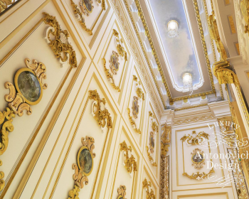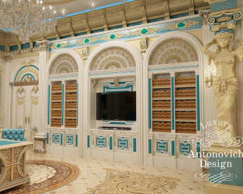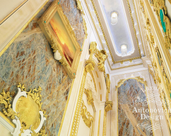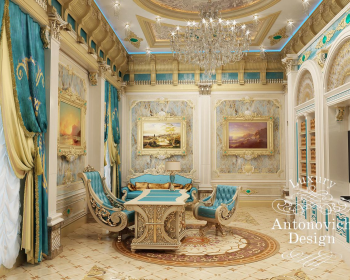 Вдохновение в работе зависит от многих вещей. Но одним из главных моментов становится та обстановка, тот интерьер, который окружает во время работы. И этот рабочий кабинет в загородном дворцовом комплексе говорит о многом. О высоком статусе его владельца, о безупречном вкусе и любви к искусству. А также говорит о том, что именно в таких кабинетах вершится история и судьбы мира. Пышная классика с акцентами барокко и рококо в данном авторском дизайн проекте стала отражением роскоши новой эпохи. Прекрасные вековые традиции в совокупности с возможностями новейших технологий становятся изумительными возможностями для создания настолько великолепных интерьеров. Дизайн рабочего кабинета вдохновляет, восхищает и приводит в восторг. Золото и благородный мрамор, шелка и дерево ценных пород, живописные полотна и скульптуры. Все эти акценты Елена Антонович объединяет в единый выразительный образ дворцовой роскоши. Дух итальянского дизайна проник в каждый уголок апартаментов. Переливы золота, блеск хрустальных подвесок и мерцания шелка завораживают и дарят чувство эстетического наслаждения. Солнечное настроение основано на гамме голубых, белоснежных и золотых оттенков. Буквально каждый квадратный сантиметр интерьера наполнен глубоким смыслом. Гармония и безупречность в каждой детали стали основой прекрасного и роскошного облика этого рабочего кабинета.