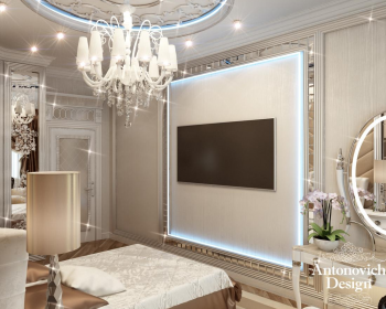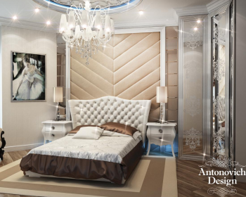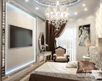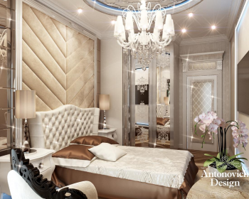 Очень вкусное настроение уютной и роскошной спальни основано на гамме сливочно-шоколадных оттенков, которые преобладают в интерьере. Стиль ар деко стал основополагающим мотивом авторского проекта элитной квартиры в Алматы. Одна из спален отражает, насколько гармоничным может быть переплетение оттенков, фактур и элементов декора. Окно занавешено односторонней шторой из нежнейшего шелкового бархата, который приподнят с помощью мягкого подхвата с крупной кистью. Интерьер спальни полон очаровательных деталей, каждая из которых является частью цельного образа интерьера. За изголовьем кровати стена декорирована текстильной панелью, обитую благородным бархатом кремового оттенка. Очаровательное мягкое изголовье кровати с обивкой из благородного текстиля сливочного оттенка дополнено в местах утяжки кристаллами swarovski. Прикроватные тумбы с изящными очертаниями делают завершенной эту часть интерьера. Нарядное настроение усиливает люстра и дополнительные потолочные светильники. Дизайн спальни стал очень тонки и изысканным отражением характера ее владелицы. Здесь все уютно и тепло, мягко и комфортно, утонченно и изысканно.