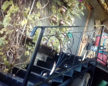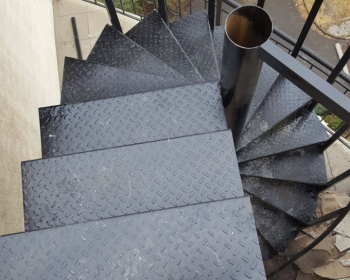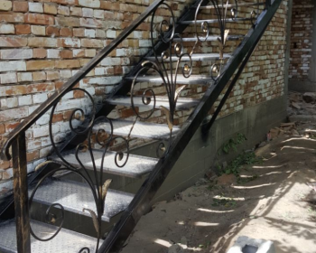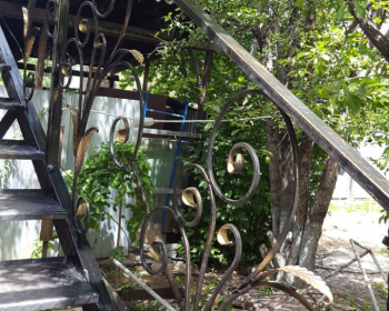 уличная лестница со ступенями из рифленого профнастила и кованными пирилами