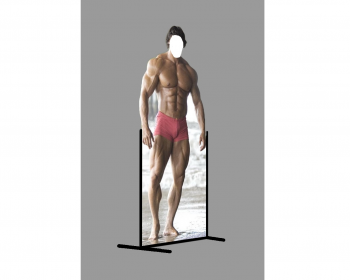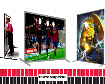 Стенд для фотосъёмки с отверстием для лица, рук, ног с изображением персонажей в разнообразных позах и ситуациях с различными фонами.