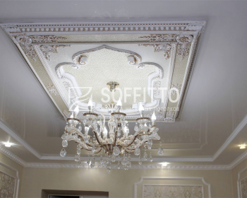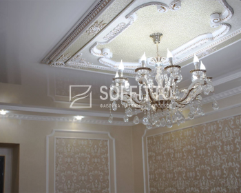 ПВХ пленка, материал современный и технологичный, прекрасно сочетается с любыми стилевыми направлением. Так, например, белый глянец, установленный монтажной бригадой Soffitto, отлично вписывается в роскошный ампир.
