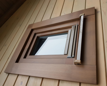 Деревянные окна из сосны и наружные двери с остеклением из лиственницы в доме и бане