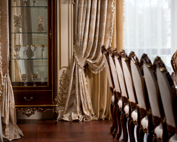 Роскошные шторы насыщенного золотого оттенка украшены классическим ламбрекеном и нежными портьерами. Благодаря этому интерьер столовой приобретает торжественное и праздничное оформление.