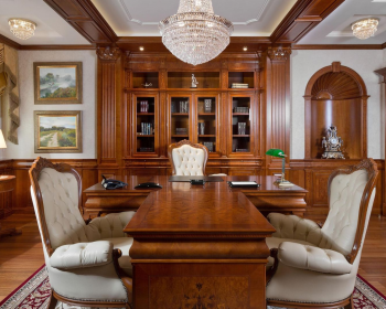 Симметрия, правильная геометрия, благородные натуральные материалы – все это классический стиль в интерьере. Перед нами эксклюзивный рабочий кабинет из дорогих сортов дерева.