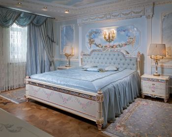 Перед нами спальня в голубых тонах, которая счастливо объединяет в себе классический стиль и традиции, но что-то в этом союзе непременно перевешивает. В данном случае на первый план выходят чистые линии классической элегантности.