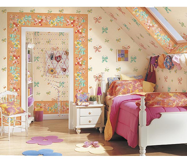 Ничто не может так испортить дизайн помещения, как неправильно подобранная гамма текстиля. Необязательно делать все однотонным или, тем более, пестрым. Постарайтесь сбалансировать цветовые гаммы. На фото это хорошо продемонстрировано: однотонное розовое одеяло, дополняют желтые простыни и подушки с узором. Вся гамма выдержана в цвет трафарета (бабочек). Если вы купите готовое постельное белье с «детской» тематикой, например, диснеевский мотив с Микки Маусом, то вы превратите дизайн помещения в настоящую цветовую «кашу». Рассматривайте дизайн комнаты в комплексе. Многие покупатели ошибаются, когда покупают просто «красивое покрывало», «красивые обои», «красивую мебель» и т.д. Никто не спорит, что по отдельности, все это смотрится довольно мило, но в соединение друг с другом, предметы и отделочные материалы в разной стилистике и цветовой гамме, могут испортить «картинку» вашей комнаты.