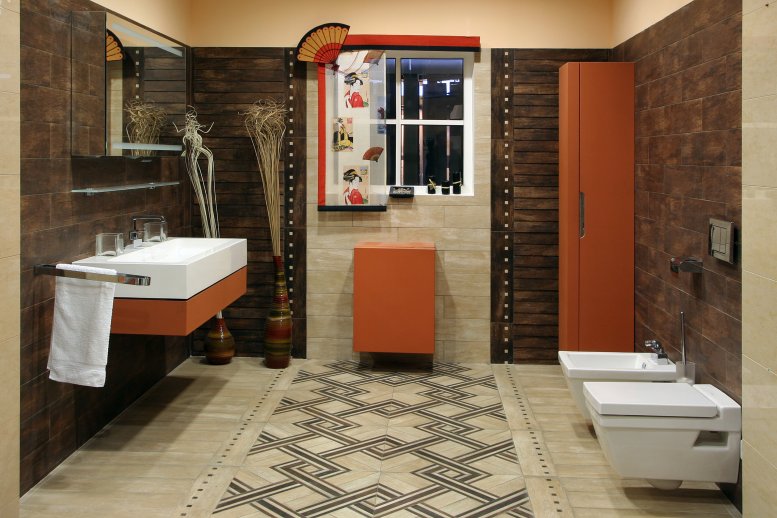 - Обратите внимание на размеры плитки. Большие, обычно предназначаются для отделки просторных помещений. Плитка, выложенная горизонтально, визуально растянет комнату в ширь, но уменьшит высоту потолка. Вертикально выложенная плитка, наоборот, сделает потолок зрительно выше. Если шов между плитками, не несёт декоративных функций (когда специально подбирают контрастную замазку), то лучше его сделать, как можно меньше. Однако, это неприемлемо для кафеля невысокого сорта - это сразу выдаст изъяны и несоответствие размеров одинаковой плитки.