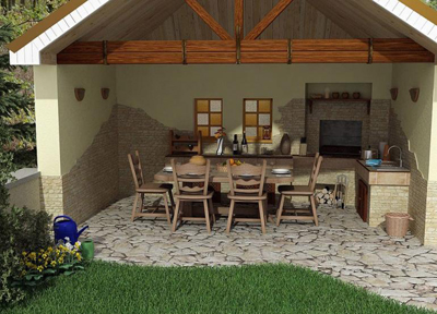 Более серьезным сооружениям подходит кирпич и природный камень. Если есть дом, то есть и крыша, которая при круглогодичном использовании должна быть теплоизолирована. В случае, если кухня расположена на открытом пространстве, роль крыши исполняет легкий навес.