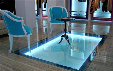 Применение подсветки в стеклянном полу позволяет визуально расширить пространство и сделать его более просторным. Для этого используются различные виды светильников: неоновые трубки, точечные светодиодные лампы, лампы накаливания и т. п., чего сейчас на рынке представлено в огромном ассортименте. Однако, каждый случай индивидуален, следовательно и выбор светильников будет диктоваться такими критериями, как особенности конструкции стеклянного пола и дизайнерские решения помещения.