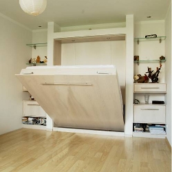 Для доступа к кровати обеспечьте не менее 90 см с каждой стороны. Возле кровати закрепите откидной столик. Это, кстати, очень полезный предмет, который может выполнять сразу несколько функций и занимать совсем немного места. Если сделать его на шарнирном креплении и продумать дополнительное освещение (например, небольшую лампу в изголовье кровати), он будет служить и прикроватной тумбочкой, и обеденным столиком, и рабочей поверхностью – для чтения или рисования.