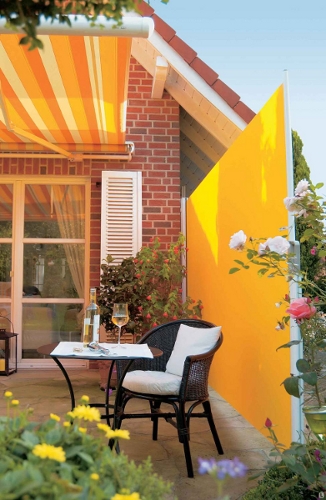 Тенты маркиз бывают яркими, пестрыми и элегантными. Последние любому фасаду придают какой-то особый ретро-шик. Их можно крепить над окнами и балконами многоквартирных домов и на дачных домиках. Так в частном доме естественно образуется что-то вроде беседки или поляны под навесом (в зависимости от ширины маркиза), где можно разместить лавочки и обеденный стол.