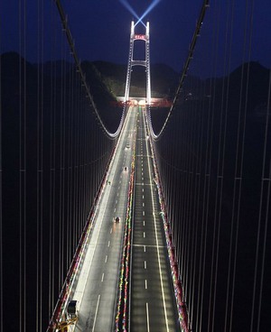 В горах центрально-китайской провинции Хунань, в конце марта успешно был сдан в эксплуатацию самый длинный по протяженности, и самый высокий во всем мире подвесной мост. Его длина составляет более 1 тыс. метров, ширина — 24 м., а высота приравнена к 1,8 км.!
