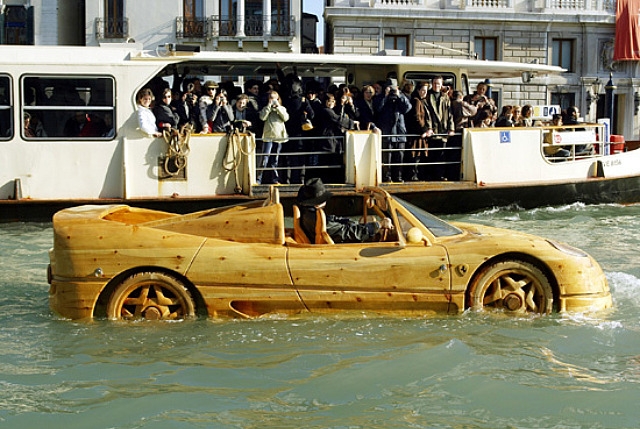 Итальянец Ливио Де Марчи (Livio De Marchi) окружил себя деревянными, собственноручно сделанными вещами, кругом и всюду! Интерьер, посуда, одежда и даже лодка-машина (!) этого чудака и небывалого мастера-художника сделаны его золотыми руками, движимыми безграничной фантазией!