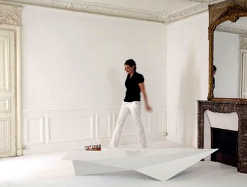 Но, если для изготовления бумажных самолетиков требуются, как мы уже и говорили, тетрадные и альбомные листы, то для создания белого самолета дизайнера потребовался лишь большой лист низкоуглеродистой стали с порошковым покрытием. Сложенный соответствующим образом, этот лист превратился в необычный журнальный столик, способный украсить интерьер любого дома или офиса. Paper Plane Coffeе Tablе, таково название «летающего» столика, однозначно сгодится и для непринужденного чаепития, и для журналов, которые можно полистать в процессе ожидания своей очереди на прием.