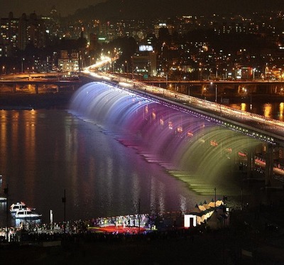 Во истину завораживающее зрелище, притягивающее к себе миллионы восхищенных взглядов и заставляющее замирать от потрясающей красоты, создает самый длинный фонтан на мосту Банпо. Удивительное творение, получившее красочное название «Лунная радуга», стало неотъемлемой достопримечательностью Сеула (Южная Корея) и вошло в Книгу Рекордов Гиннеса, благодаря несравненной протяженности и необычному месторасположению. Прогремевший на весь мир своей популярностью чудо-фонтан на мосту, пересекающем реку Хан, был официально открыт в мае 2009 года. Полная длина «Лунной радуги», учитывая обе стороны моста Банпо, составляет 1140 метров.