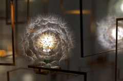 Головки одуванчиков расположены на бронзовой структуре, напоминающей монтажную плату, что создает ощущение, будто нежные невесомые одуванчики волшебным образом парят в воздухе. Аквариум с рыбами вместо забора