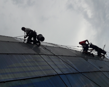 Сильное въевшееся окись алюминия, стекшая с дождем и снегом с алюминиевого кровельного покрытия, солевой налет, достаточно крепко осела на поверхность тонированного стекла. Нашей команде пришлось использовать довольно агрессивные виды моющей химии и силовых методов удаления загрязнения.