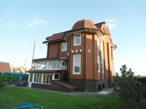 Сруб дома был построен из клееного бруса. Особенность этого дома заключается в необычном планировочном решении - к основному объему дома были пристыкованы три резолита многогранной формы. Нестандартная решения пришлось применить и на крыше. Элементы стропильной системы изготавливались непосредственно на производстве.