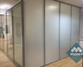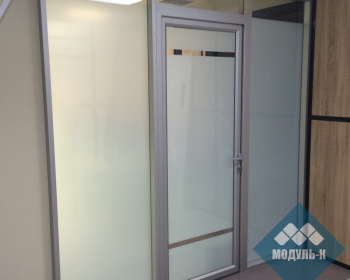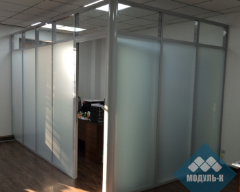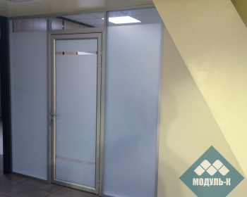 Офисные перегородки из алюминиевого профиля, одинарного остекления, стекло 6мм, каленое, тонировка стекол белой матовой пленкой.