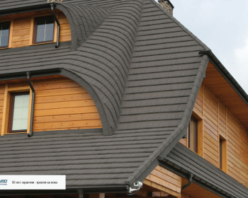 Композитная черепица производится из металла, покрытого алюмоцинком и натуральным камнем. Является самым надежным, ветроустойчивым и долговечным кровельным материалом на сегодняшний день. Гарантия от завода-производителя составляет 50 лет и распространяется на выгорание, осыпаемость каменного напыления и коррозию металла. Имеется 6 разных профилей и множество цветовых решений для Вашего дома.